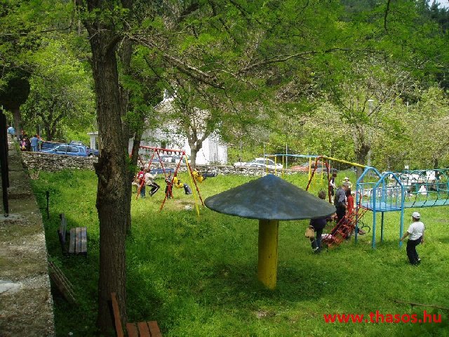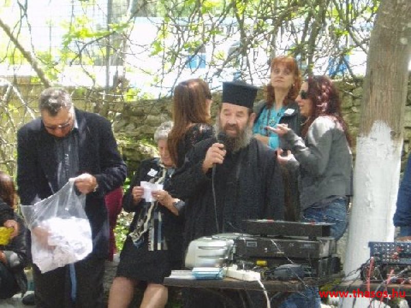 A liturgia után a Metoxi kolostor udvarán felállították magnójukat. Egy flekkenezőt is oda tettek. Ki sütött, ki rögtön táncolt is. Majd jöttek a falu többi emberei is, és évről évre hozzátett valamit e szép hagyományhoz. Kora reggel kezdődik a liturgia, mely kb. 11.00 órakor ér véget az egyházi étel szétosztásával az előző nap böjtölő emberek közt. A bárányos étel után kezdődik a közös mulatság. Talán a régi magyar május elsejére emlékeztető a kép és a hangulat. A sziget összes lakója itt van ezen a napon. A hegyoldalban sátrak, flekkenezők. Ki-ki készül egy kis csemegével az egész napos mulatságra. Megy a népi tánc, örül mindenki és a társaságok köszöntik egymást. A nép oly nagy hanggal van, hogy a szintén hangos forrás csobogását csak az hallja, ki szomját oltani a kúthoz megy.