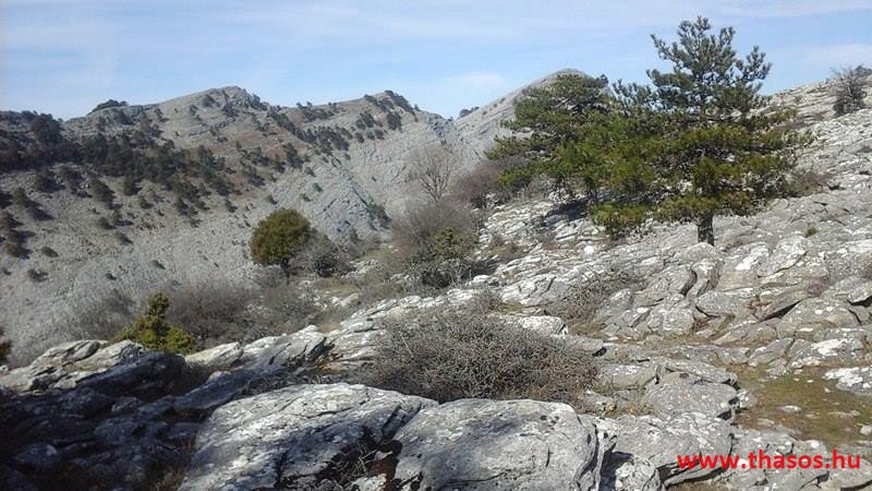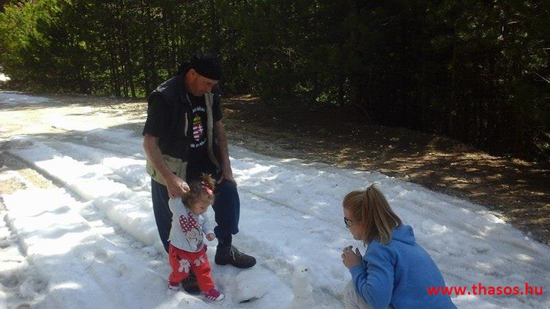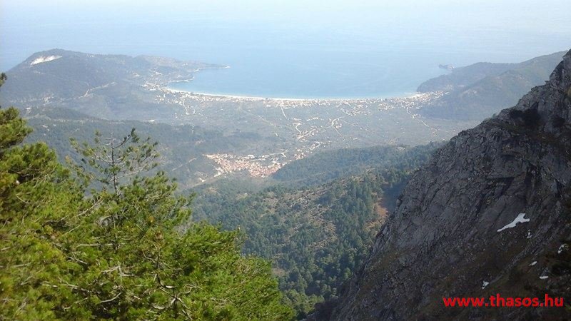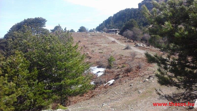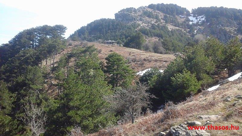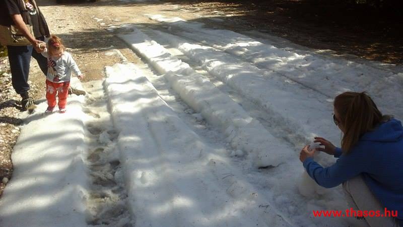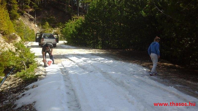 Utunkat folytattuk felfelé a menedékházhoz. A tiszta atmoszféra csodálatos tájat mutatott a sziget belsejéről és a sziget déli tengerpartjáról, valamint a távoli Athos nyúlványról. Az út végig tökéletes volt. A forrást ahogy elhagytuk, kissé meglepődve álltunk meg. A partvidékről ahogy a hegyre nézünk, lehetett látni a fehér foltokat. Sejtettük, hogy fogunk majd hóval találkozni a csúcs felé, de hogy közvetlen az úton lesz havas kalandunk, az váratlanul ért bennünket. 30-50 cm vastagságú jéggé fagyott foltok voltak az úton. A menedékház forrása előtt szinte teljes hosszúságban ott volt a hó. Utolsó havazásunk február 11-én volt. A hegy ezen szakaszát a nap keveset érheti, és valószínű az első decemberi hótól február közepéig csak gyűlt-gyűlt a sok hó, így maradt a 3 hetes napfényes idő ellenére is.