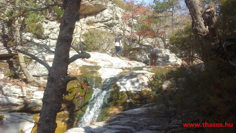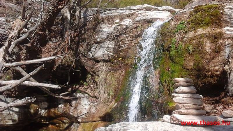 A vízcsobogás, a szél elcsendesülő, majd felerősödő játéka, mindenféle madártrilla, a fenyőtoboz kipattanásának alapzaja, ezek mind-mind egy édes dallamként fogadtak bennünket. A mindenfelé sárgán világító kicsiny krókuszok, a hó alól kibukkanó hóvirág, a kicsiny cserjék hamvas üde zöldje. Minden oly szép, oly fenséges, leírni azt nem lehet. Érezni kell azt. Flekkeneztünk, pihentünk, majd kora délután hazaindultunk. A Jenna tónál újra megálltunk. Tudatosan. Akik gyalogtúrával mennek oda Mariesből, a mézárus placc előtt a sziklaoldalban van egy, túrázók által a sziklára tett jelölés. Nyíl mutat lefelé, a sziklára rajzolva. Nyíl és Ypsárió. A járatlan túrázót ez arra készteti, hogy az igen meredek falon felkapaszkodjon. Pedig a nyíl lefelé mutat. De ha már felmászott, úgyis rájön, hogy oda feleslegesen mászott fel. A nyilat szembe mutatónak szánták, akik felfestették. Jelzik, hogy szemben az Ypszárió egy patakjának a kb. 6 méter magas vízesése van. Ez a tó mögötti folyó szurdokvölgyben, igen rejtett úton található. A látvány mindent megér. Leereszkedtünk hát a mélybe a nagy-nagy vízeséshez. E vízesés nem a tótól jön. A tónak a vizét vastag csőbe gyűjtik és vezetik Maries hegyi falujához. Az Ypsárióról több patak a hegy nem járható részein csörgedezik, és itt is a felületes gyors turista számára örökre rejtve marad. A vízesés patakja egészen Mariesig halad. Több belső kis tóval csipkézett, óriási platánokkal szegélyezett. Mariesnél a vizét hasznosítják, majd a többletet engedik aláfutni egészen a 12 km-rel lentebbi parti falurészbe, hol a tengerbe fut. A hegyi Maries alatt van egy kápolnánál egy kiépített pihenő park. Odáig még nyár végén is csordogál a vize. De onnan tovább elveszik. Ki tudja, talán az állattartók, vagy a márványfeldolgozó üzem használja azt fel.