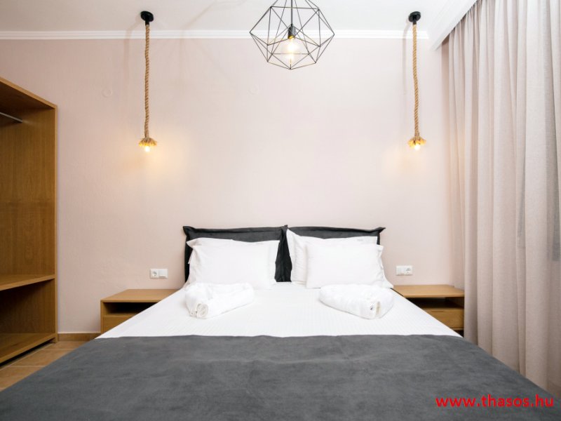 A lakások berendezése: nappali, konyhasarok, tv, légkondicionáló berendezés, kisablakkal ellátott zuhanytálcás fürdőszoba, egy tágas hálószoba az ahhoz tartozó berendezésekkel felszerelve. A kettő helyiséges, de egy hálószobával rendelkező apartmanlakások 45 m2-sek és a hozzájuk tartozó kerti teraszok méretei nagyok.