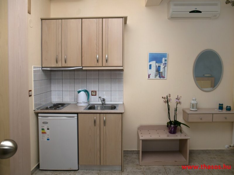 A konyhasarok nélküli lakások vendégei részére az emeleten van egy közös konyha gyors ételek elkészítésére. Úgy a lakásokban, mint a három lakás részére kialakított közös főzőhelyiségben nagyobb főzés, serpenyőzés, sütés nem lehetséges. A konyha inkább teakonyha jellegű. Egyszerűbb ételek, rizs, zacskós ételek elkészítésére alkalmas. Mikrohullámú berendezés nincs. A tengerparti bárkerten és a társalkodó verandán túl egy hangulatos recepció , vendégszalon és reggeliző helyiség szolgálja a vendégek kényelmét.