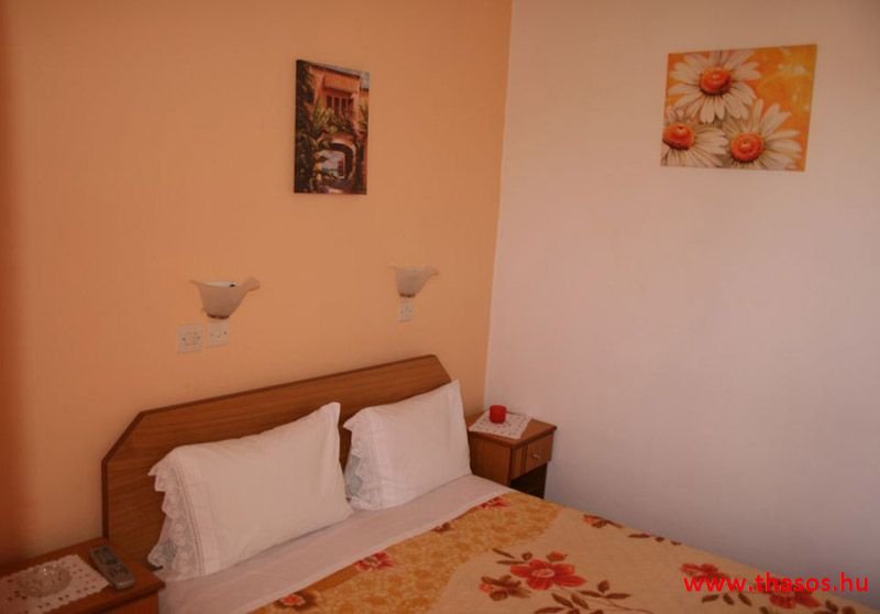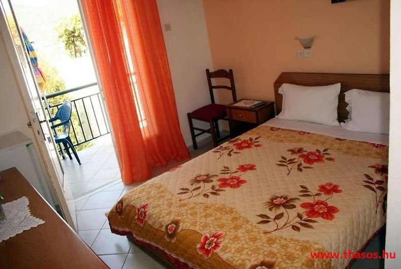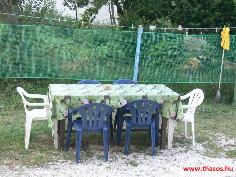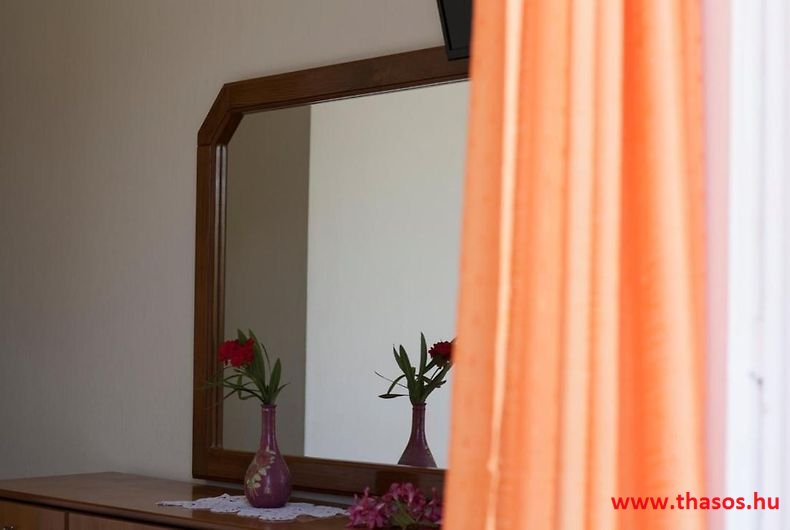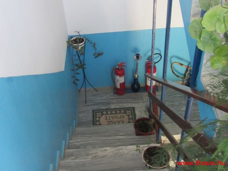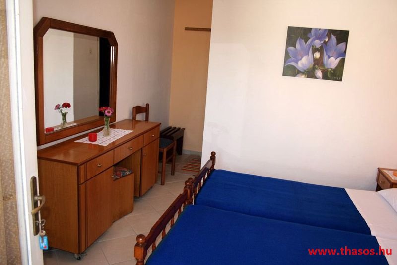 A lakások berendezése a hagyományos görög lakások stílusa, egyszerű, de tiszta és férős. A konyha és étkező a második emeleten van. A konyhában nagyobb társaságok minden típusú ételt készíthetnek. Étkezési lehetőségek: egy nagy társaság részére a külön helyiségű emeleti ebédlőben, vagy a belső parti udvar erre kialakított két területén, vagy a lakások saját teraszán. A lakásokban tehát belső konyha nincs, csak kávéfőzésre alkalmas kis turista gázfőző. A lakásokban az ágyak elhelyezése is olyan, hogy nyitott ajtó esetén, akár az ágyban fekvő helyzetből is elénk táruljon a tenger teljes képe. Minden lakásban van egy derékig érő, tehát normál nagyságű és közepes teljesítményű, felül egy fagyasztó fiókkal ellátott hűtőszekrény. A lakások berendezése tehát hálószobabútor, főzés néküli teakonyha sarok a hűtőszekrénnyel, zuhanytálcás fürdőszoba, hol hajszárító is van és a terasz az asztalkával és a hozzá tartozó székekkel. A gyermekek játszására csak a tenger homokos partszakaszán van lehetőség. Flekkenezési lehetőség a mobil flekkenező készülékkel a belső udvarrészen.