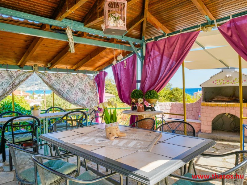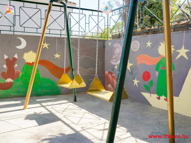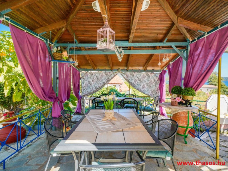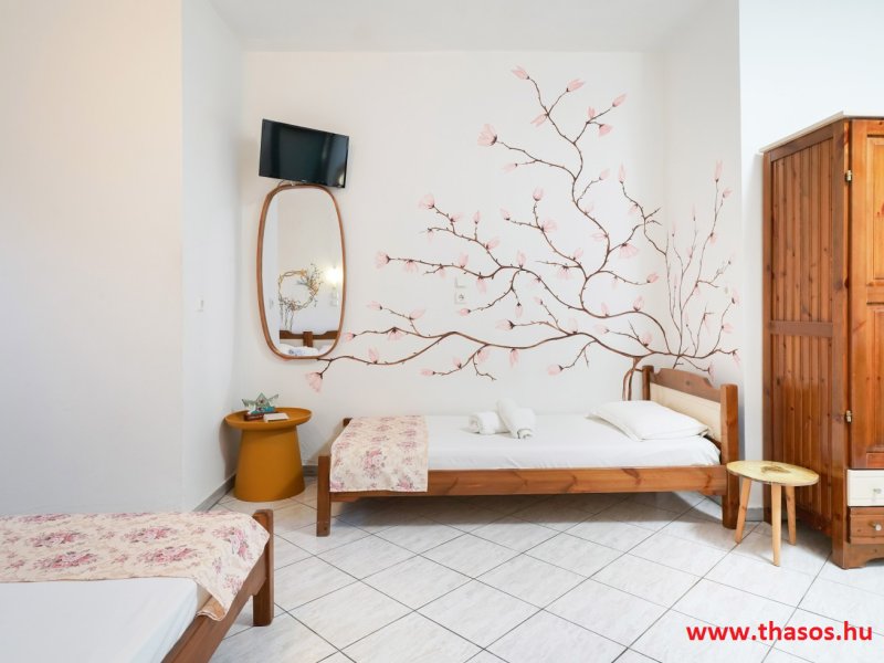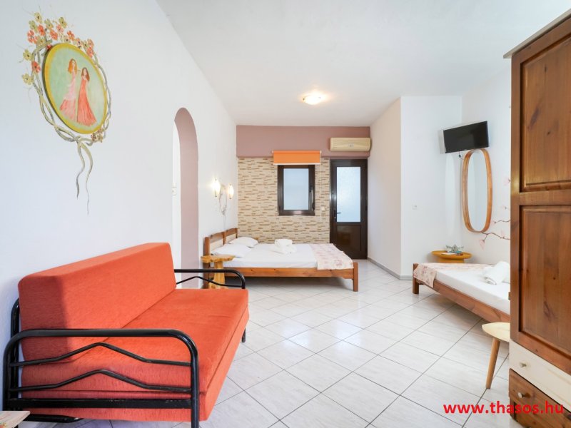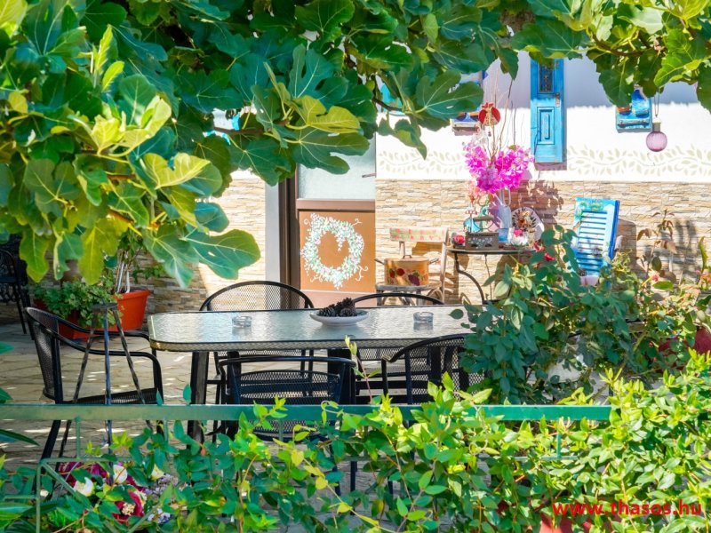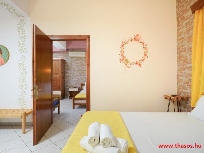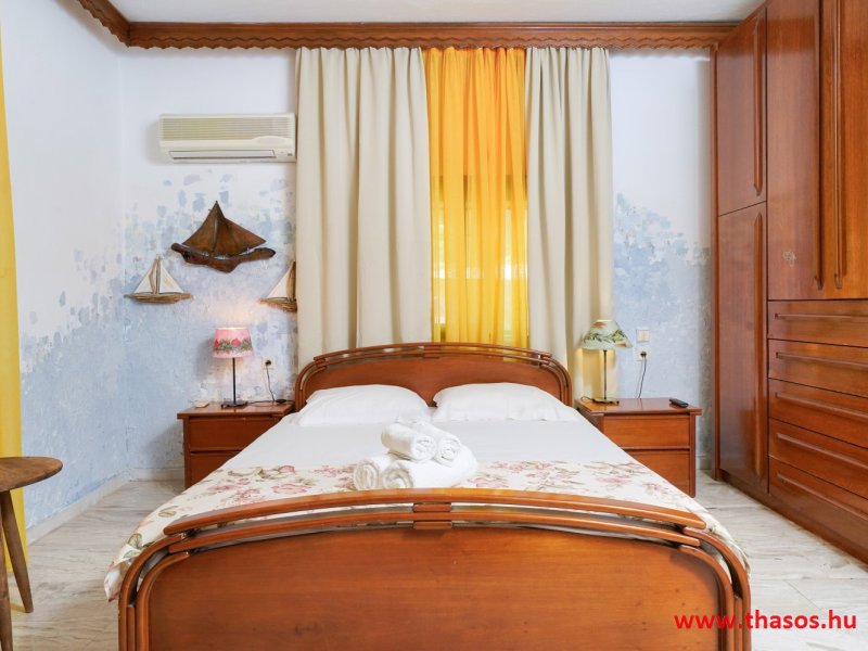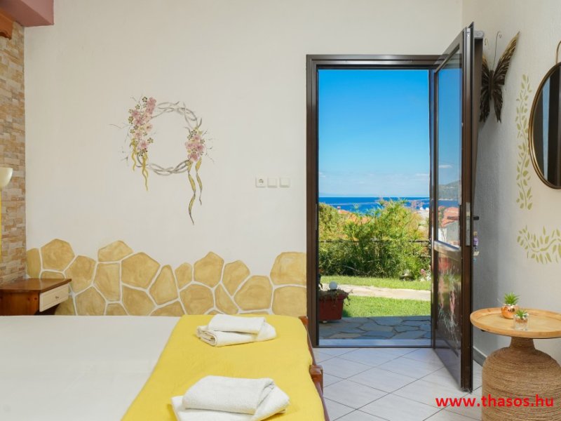 Az Ifigénia butikapartman ideális úti cél azok számára, akik nyugodt nyaralásra, minőségi pihenésre vágynak, újra kapcsolatba akarnak kerülni a természettel, és egyedi szálláslehetőséget keresnek. Az apartmankomplexum egy építész mérnök háza. A telket megemelve arra törekedett, hogy pazar tengeri kilátás legyen az öbölre. Az ház belső lakásai szintén belső építész alakította ki. A lakások elnevezése ezek miatt, inspirációként a görög mitológiát és a kilenc múzsát, a művészetek és a tudományok különböző területeivel kapcsolatos istennőket választva. Az egész ház egy csodálatos varázs. A ház helyzete szintén remek. egy lélegzetre a színes forgatagos turista sétánytól, ahova az egész szigetről érkeznek. Földszint: Melphomene Apartman-stúdió. A lakás 45m2, kettő bejárattal rendelkezik. A főbejárat felől kettő nagy méretű egyszemélyes fotelágy jobbról és balról. Közöttük tágas tér. A bal oldali fotelágy mögött a válaszfal a hálórésztől 2db nagy méretű szekrény ötletes, hangulatos díszítéssel. Ez a kialakított légtér, ahol kettő személy alhat, 6m2-es. A fő hálótér innen nyílik, amiben a szokásos szobabútorok vannak: ikerágy, komódok, tükör, ruhásszekrény. A nagysága: 15m2. Ennek is van külön kijárata, ami a tenger oldala felőli teraszra vezet. A fő hálótérből nyílik a tágas konyha, ami minden otthoni háztartási felszereléssel rendelkezik. A konyhában kényelmes étkezőrész is van. Az étkezőrészből nyílik a süllyesztett sarokfürdőkádas fürdőszoba. A fürdőszoba 5m2. A fotón átalakítva láthatják. A szekrények visszahelyezésével a lakótér egy légterűvé változik. CLIO. Ez egy tágas méretű apartman. A lakásba lépve van egy tágas nappali, ahol baloldalt 2 fős ikerágy van. A konyha a nappali jobb oldalán van. Közvetlenül a konyharész mellett nyílik a nagy méretű fürdőszoba, aminek a berendezése toalett, általános fürdőszobai kellékek. A hálószoba a nappali bal oldaláról nyílik. Berendezése egy két fős ikerágy, és egy kanapé, ami alvásra is szolgálhat. A hálóban van a tv és a légkondicionáló berendezés. A nappalit és a hálószobát egy tolóajtós faajtó választja el. A háló otthoni komforttal felszerelve, teljes falat betöltő bőséges szekrény. Ami ennek a lakásnak még az előnye, hogy nagy méretű kétszárnyas ablakkal rendelkezik a nappali és a hálószoba is, ahonnan rálátás nyílik a teraszra, a parkra, és a tengerre. Tehát az egész apartmanlakás világos, szellős és gyönyörű panorámájú, ha kinyitjuk az ajtókat, ablakokat. Ehhez a lakáshoz két terasz tartozik. Az egyik a hegyoldalra, a másik az épülethez tartozó gondozott parkra és a tengerre néz. 2008. júniusában lett a lakás felújítva. Polymhnia Kettő darab iker stúdió. Mind kettő stúdió rendelkezik, Tv, légkondicionáló berendezés, saját konyha sarok, saját fő bejárat, saját fürdőszoba, saját terasz résszel rendelkezik. A kettő teljesen felszerelt lakás közt a közös falon van egy ajtó, mely bejárást engedhet a kettő lakás közt. Valamint a kettő lakás előtt, van egy gyönyörű tengeri kilátású közös terasszal is. Ideális lehet kettő baráti házaspárnak, akár egy - egy kis gyermekkel is. Első emelet: EUTERPE Apartman-stúdió. Az épület jobb oldalán van. A tágas hálószoba 4 ággyal és egy kanapéággyal és a normál hálószobai bútorral rendelkezik. A hálóból a hegy felé nyílik egy tágas konyha, aminek a berendezése szintén a megszokott normál berendezés. A konyhában van egy kényelmes étkezőrész is. A fürdőszoba normál méretű és zuhanytálcás. A hálóból nyílik egy óriási erkély, ami körbevezet az épület jobb oldalától egészen az épület eleje tengerre néző oldalára a háló teljes szélességében. CALLIOPE stúdió Napfelkelte a tengeren az ágyból látható. Ez az előzőnek a tükörképe az épület bal oldalán, de egy kicsit kisebb, ezért csak 4 fős. Ágyai 3 normál ágy és egy fotelágy. TERPSICHORE stúdió Napfelkelte a tengeren az ágyból látható. A Calliope stúdió szomszédja keletre nézve. Mérete és elrendezése azonos a Calliope stúdióval. ERÁTÓ stúdió Az épület egyik legkedvencebb stúdiója. Elszeparált különleges hegyi páholyú terasza a lakás ékszere. Kettő normál ágy és egy fotelágy 3 fő normál ágy felnőtt és egy gyermek fotelágy részére kényelmes. Kis konyhájából nyílik kilépés a teraszra. Második emelet: URÁNIA Apartman. Széles biztonságos lépcső vezet a legfelső szintre. A tágas hálószobában 3 db ágy és egy kanapéágy és a normál hálószobai bútorok, szekrény van. Innen nyílik a másik helyiség, ahol franciaágy, konyhasarok és hangulatos étkező, csodálatos rálátással a tengerre. E helyiségből nyílik a zuhanytálcás fürdőszoba is. THÁLIA Apartman. Az Uránia apartman bejáratától tovább haladva a függőfolyosó végében található. Szolgáltatás: Földszint: 1 db 3+2 ágyas apartmanlakás /CLIO/ Első emelet: Második emelet: Apartman 2+2 fő lakás/4 fő Melphomene - 15 Euró/éjszaka/lakás/4 fő 5. fő + 10 Euró extra költség Stúdió 2-3 fő Polhimnia stúdiók 2 fő/- 3. fő +5 Euró költség A megadott árak nem tartalmazzák a helyben fizetendő extra turisztikai adót. 2025. évben a stúdiók 2 Euró, az apartmanok 5 Euró/éjszaka/lakás ár extra költséggel rendelkeztek. Calliope Stúdió Kert képek Képek az öbölről