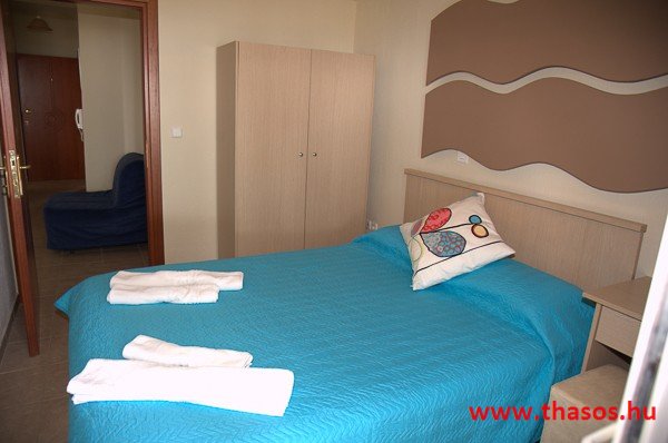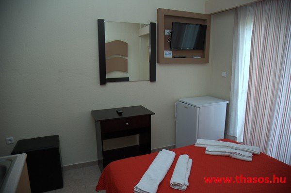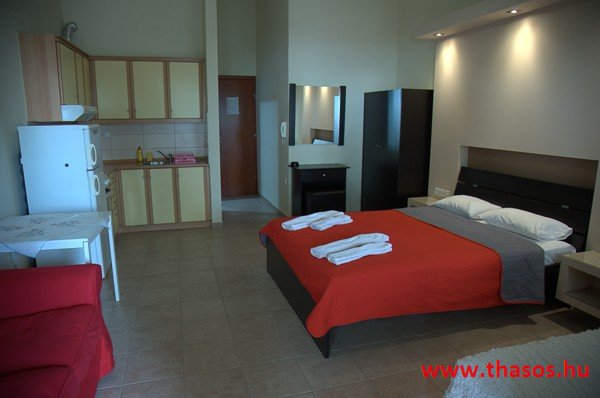 A stúdióban franciaágy, étkezősarok asztallal és székekkel. A konyhasarokban csak hűtőszekrény található, így csak hideg ételek elkészítésére alkalmas. A különálló, zuhanyzós fürdőszoba nagy méretű. Kényelmes terasza van, ahonnan kilátás nyílik az Ypszário-hegyre. Ez a stúdió két személyt vagy egy kisgyermekes párt képes befogadni.