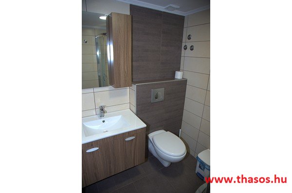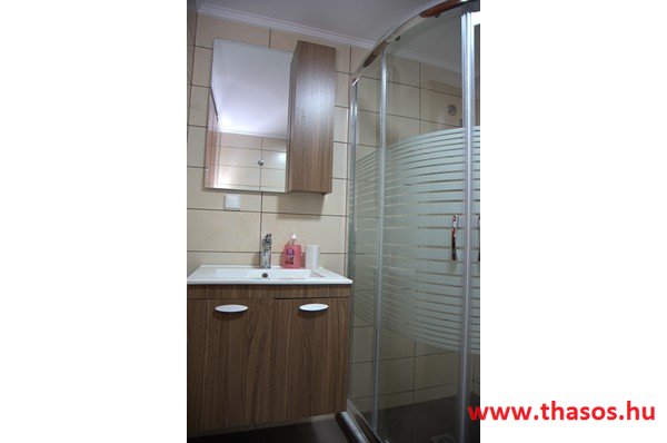 Az első emeleten egy csodálatos, nagyon tágas stúdió van, teljes kilátással a tenger felé. Az egylégterű nagy szoba franciaággyal, egyszemélyes ággyal és háromüléses kanapéval berendezett. Szükség esetén fotelágy is felszerelhető. A konyhasarok közepes főzési lehetőséget biztosít. A fürdőszoba tágas, zuhanyfülkés. A nagy erkélyről akadálytalan panorámás kilátás nyílik a kertre, az Aranypartra és az Égei-tengerre. A stúdióban kényelmesen elfér 5 fő.