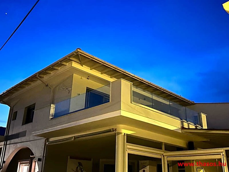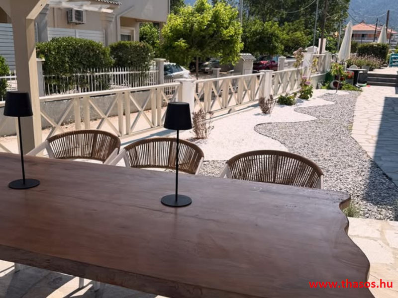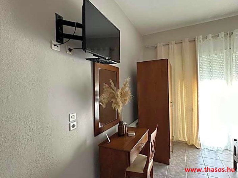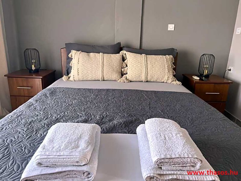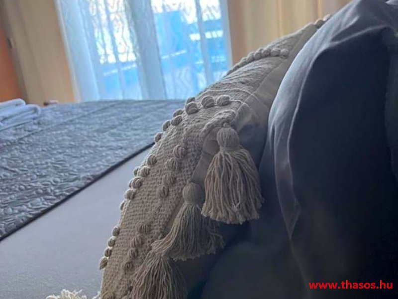 Elhelyezkedése a "Nagy strand" déli részén. Strandja elegáns, napágyakkal ellátott, széles fövényű. A strand homokos fövényének szélessége és az ott elhelyezett bérelhető napágyak mellett kényelmesen elférnek azok is, akik a saját napsátrukat szeretnék ott felállítani. A víz a szállás előtt sekély és áramlatmentes. Kisgyermekesek részére is kiváló. A szállás előterében a napközbeni strandolók ellátására szolgáló csendes kávézó és fagyizó bár várja a partról felsétáló vendégeket. A szállás vendégeinek a teraszról sincs teljes rálátása e bár-részre. A pihenés a nap és éjjel teljes szakaszban tökéletesen biztosított. Azon vendégeknek, akik esetleg reggeli vagy napközbeni taverna jelleget, snack-ellátást kérnek a lakásukba, erre van módjuk. Erre előfizetés nincs. Ennek részletes megbeszélése és kérése, ott helyben történhet. Felszerelése: Minden lakásban a normál konyhai tartozékok vannak. Közepes méretű, fagyasztórésszel ellátott hűtőszekrény, kétlapos villanyrezsó. Edények és kiegészítők szintén alap ellátásban. Kiegészítőként rendelkezik a konyha holland kávé- és teafőzővel. A kotyogót te hozd magaddal. Konyhai kiegészítőket is, ha nagyobb főzést szeretnél nyaralás alatt. A lakások fürdőszobái zuhanytálcásak és tolóajtós zuhanyzó ajtóval ellátottak. A lakások berendezéséhez tartozik a Tv és a légkondicionáló berendezés. A két apartman mindkét helyiségében külön légkondicionáló berendezéssel rendelkezik. Összességében kényelmes nagy lakások, hangulatos, szép kilátású teraszokkal. Nagyon igényes, ízléses a berendezése. EMELET N.2: 2+2 ágyas emeleti apartman 2015 -ös évben lett átadva. Egy hálószobás, 4 főre kényelmes. gyermek ágy elhelyezése lehetséges. Mind kettő helyiségerendelkezik légkondicionáló berendezéssel. Kettő terasszal rendelkezik. Pazar kilátással keletre, hol a tengerből kell fel a nap. De ugyan igy szeretik vendégei az északi, bejárat felőli hegyi kilátású teraszát is. A N1 studió és N2 apartman szomszédosak. Terasz elválasztó fal, nem létezik. Emiatt ajánlom baráti családoknak. Egyéb esetben a terasz választófal nélkülisége zavaró lehet. N. 1: 2+2 ágyas emeleti stúdió,- egy árnyalattal kisebb a szomszédos N:2-es lakásnál. Kettő normál ággyal és egy nagyméretű kinyitható kanapéággyal rendelkezik. FÖLDSZINT N. 3:. 2+2 +2 ágyas közepes teraszú, egy külön hálószobás apartman típusú lakás. A hálószoba franciaággyal, a nappali kettő személyes kinyitható kanapéággyal rendelkezik, akár négy közepes korú gyermek számára megfelelő mérettel. Terasza oldalsó fekvésben néz a tengerre, gyönyörű tengeri és hegyi kilátású, bár nem látszik a teljes 3 km-es öböl, csak a közepétől a déli csücskéig. N. 4. studió:. 2+2 ágyas Hatalmas méretű teraszú. Egy légterű studió lakás Francia ágy és kettő gyermek részére kinyitható kanapé ágyl. Bár oldal fekvésben van a tengerre, még is gyönyörű panoráma élvezhető a teraszról. A hegyre is azonos szép panoráma onnan. Baba ággyal pótágyazható. Reggelizési lehetőség: 14 Euró/fő/ nap/felnőtt - 2 éves korig ingyenes - 2-8 éves korig 7 Euró/fő/nap Képek a szállásról