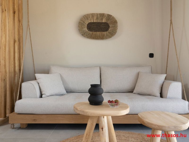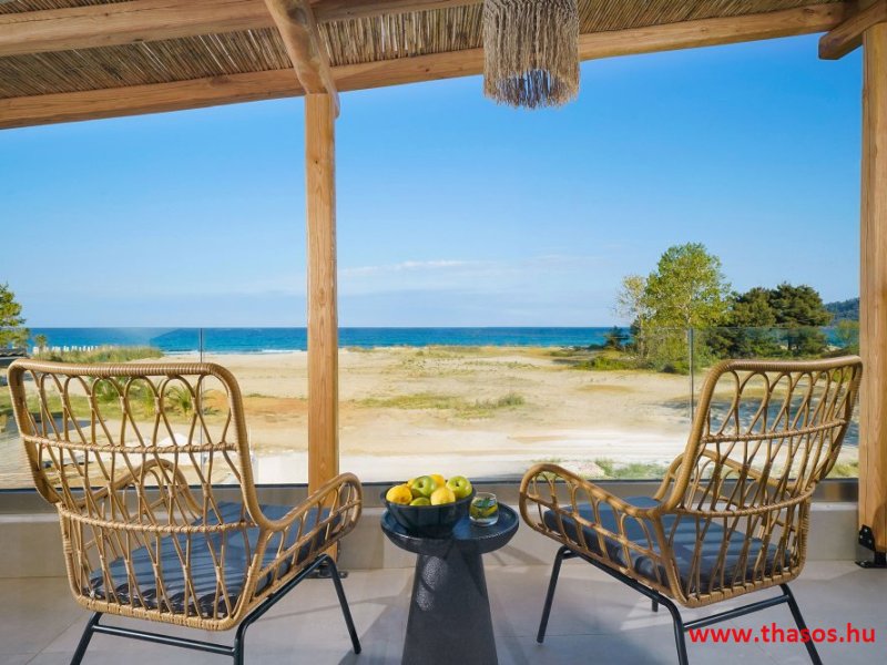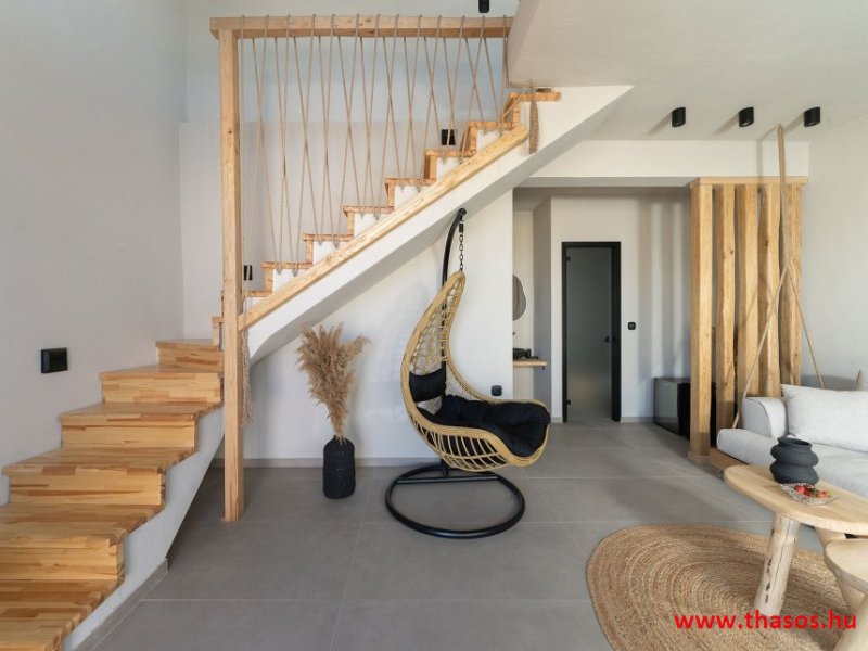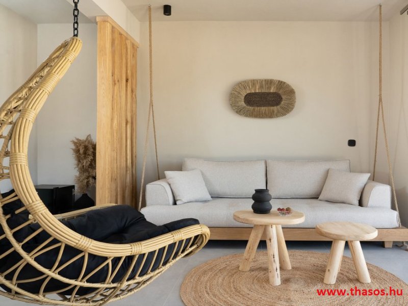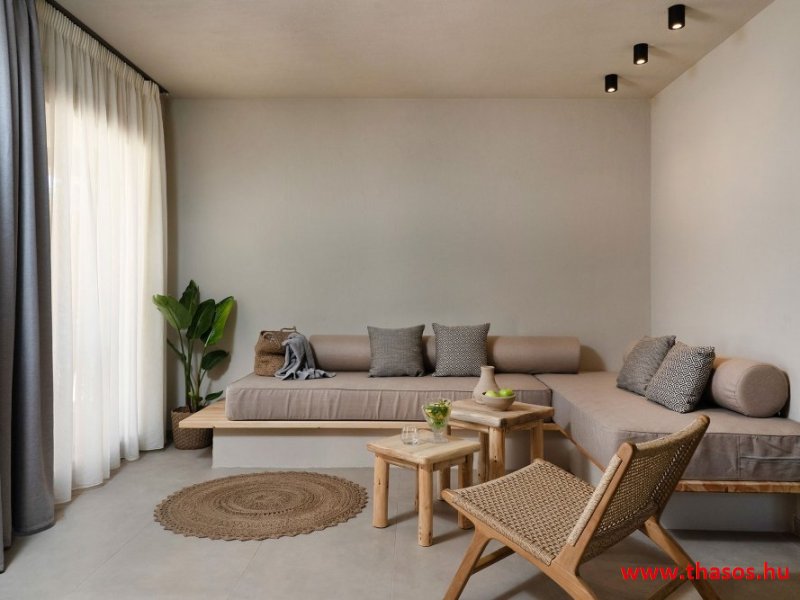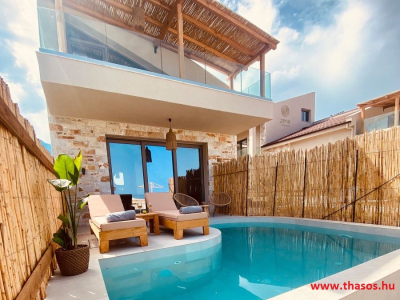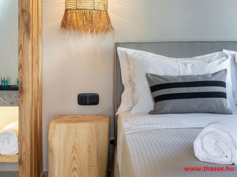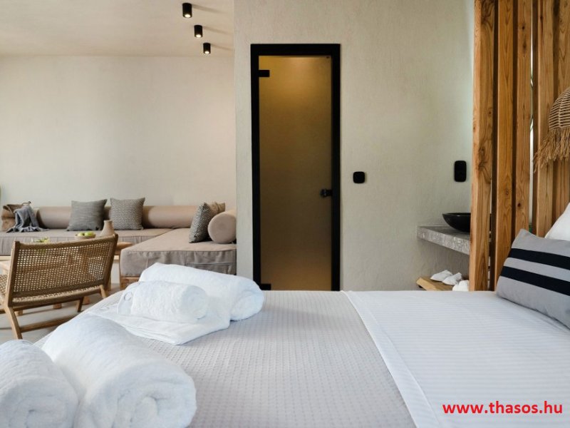 Elegáns, kétszintes, 44 négyzetméteres lakosztályaink a magán medencés hotel elején, a tengeri frontján találhatók. Ezek a kétszintes lakosztályok lélegzetelállító kilátást nyújtanak az Égei-tengerre, ötvözve a víz egyedi smaragd árnyalatait a földi hangulattal és a bohó-minimális esztétikával. Minden természetes anyagokkal berendezett. Kővel, fával, bambusszal díszített lakosztályban két hálószoba található, amelyekben különböző szinteken található kétszemélyes ágyak és egy nappali kanapéval vannak. A felső szinten egy tágas erkély is található, ahol a vendégek pihenhetnek és élvezhetik a mélykék tenger és az aranyló homok lenyűgöző kilátásának, a tengeri szellő, a felejthetetlen táj és a csodálatos napfelkelte kombinációját. A földszinti lakosztályban egy látványos szabadtéri medence található, hűs vízzel és teljes panorámával a kék Égei-tengerre.