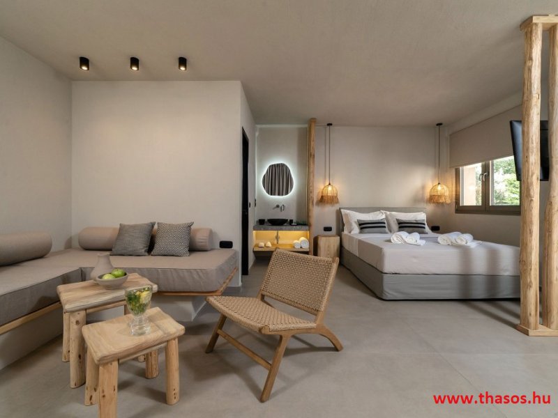 Ezekben a lakosztályokban egy csendes menedéket talál, amely ideális a teljes kikapcsolódáshoz és békéhez. A harmadik épület földszintjén találhatók, 32 négyzetméter alapterülettel. A lakosztályok a nyugalom végtelen pillanatait kínálják azáltal, hogy a meleg földszín-kombinációkat és a minimális dekorációt ötvözik a saját nyugágyak használatának lehetőségével a lakosztály terasza előtt, ahonnan egyedülálló kilátás nyílik a tengerre. Minden lakosztályban a nappaliban egy franciaágy és két egyszemélyes ággyá alakítható kanapé található, és akár 4 fő elszállásolására is alkalmas, kényelmes és pihentető élményt nyújtva.
