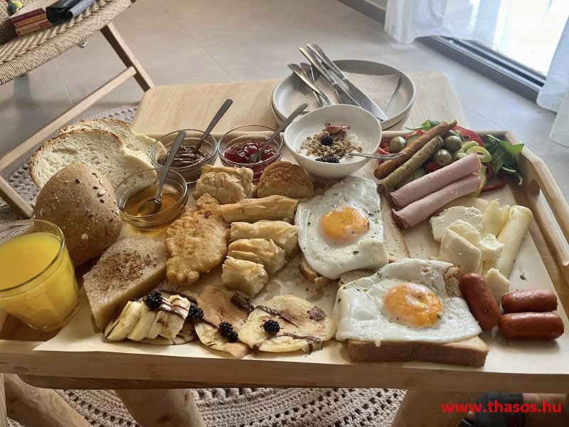 A személyzet szolgálja fel. Friss kenyér, péksütemény, vaj, lekvár, kávé és tea, felvágottal, sajttal, zöldséggel és gyümölccsel kibővített változata.