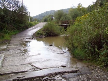 A következő napon csak úgy kerestünk célpontot… Visszamentünk a falunkba, megnéztük a modern, szép templomot, elkísért minket egy sánta kutyus nagy barátsággal, aztán továbbmentünk arra a helyre, ahol az út keresztezi a folyót. Most megnéztük alaposabban. Mivel a víz nem magas, ezért a folyóágyat kibetonozták, híd helyett, és a csordogáló vízben kell keresztülhajtani. De mára már elég csúnya állapotban van az a beton… kiderült, hogy mellette csináltak egy kis hidat is, amin éppen elfér egy személyautó. Átküzdöttük magunkat a kátyúkon a hidacska felé, amikor jött egy másik autó, kisebb, mint a mienk, és keresztülhajtott a vízen. Háááát… sikerült neki, de ahogy elnéztük, lehet, hogy lábat mostak bent a kocsiban…