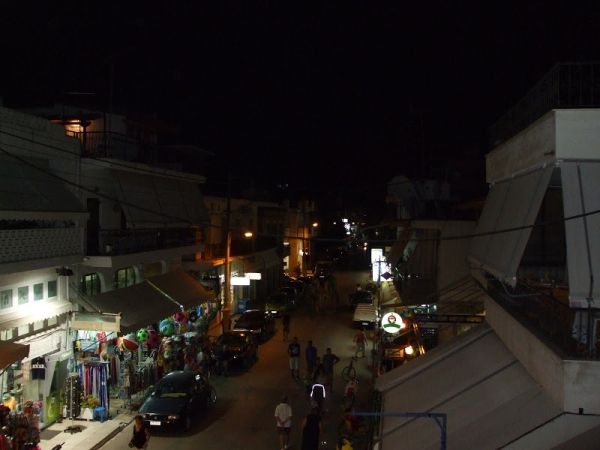 Két-két gyros és szuvlaki, mellé sültkrumpli. Kb. 10 perc alatt kész is, mindez, ha jól emlékszem 13€, és már indulunk is bekebelezni. Megterítünk, körbeüljük az erkélyen a kisasztalt - illetve ketten félig a szobában ülnek -, de a tolóajtónak köszönhetően mégis majdnem az erkélyen. Az utca esti forgatagát bámulva, tervezgetve a következő napokat fogyasztjuk el az első esti vacsorát. Ami egyébként nagyon jó döntésnek bizonyul, mert finom és sok, a krumpli is rengeteg, ráadásul kellemesen fűszeres. Jó kis este ez, mert ott vagyunk a központban, és mégsem. Késő este egy kiadós zápor picit felfrissíti a levegőt, és lehet, hogy ezért, lehet, hogy másért, de piszkosul jól alszunk.