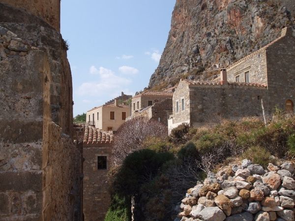 A turizmus már ide is betette a lábát, látunk giccs-szuvenír boltokat, de valódi kézműves termékekkel is találkozunk. Megpihenünk egy bizánci stílusú, de mai modern kávézóban. Aztán bebarangoljuk a helyet, gyönyörködünk az elénk táruló kilátásban, bekukkantunk a szintén felújított templomba. Ahogy beljebb érünk, egyre több a romos épület, de a ledőlt falakból származó kövek ott vannak mellettük, gondosan gúlába rakva. Mintha csak arra várnának, hogy valaki ismét falat emeljen belőlük.