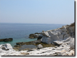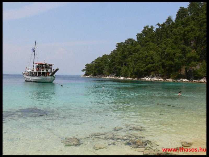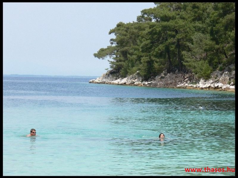 A napot egy, az elmondások szerint varázslatos part felfedezésére szántuk. El is indultunk reggeli után a fõváros irányába. A fõvárosba érve nem sokkal a fõútról való lehajtás után jobbra Makriammos fele kell venni az irányt. Ott nem kell elmenni a bejáratig (Makriammos strandja fizetõs), hanem elõtte jobbra le kell térni a földútra (térképen lilával jelölve). A jó minõségű földúton (mely vastagon márványporral van borítva, ami a sötét autónkon szépen nézett ki) 6 km-t kell menni, közben átmegyünk egy kikötõn, ahol a márványt osztályozva tárolják. 6 km után egy gyalogút ágazik balra lefele, mellette egy kis "parkolónak" kialakított hely. A gyalogúton lesétálva egy rendezetlen, de csodálatos part tárul elénk. A homok valószínűleg márványporból van, annyira finom. Viszont mindenkinek ajánlom, hogy ne hétvégén mennyen, mert délután 1 körül sorba jöttek a szebbnél-szebb, nagyobbnál-nagyobb jachtok, gondolom a helyi gazdagok, akik a hajón grillezték a tengerbõl frissen fogott finomságokat. Késõbb még egy turista hajó is megjelent rengeteg iskolással. Mivel az iskolásokkal "megtelt" a part, így úgy döntöttünk, hogy mi megyünk.