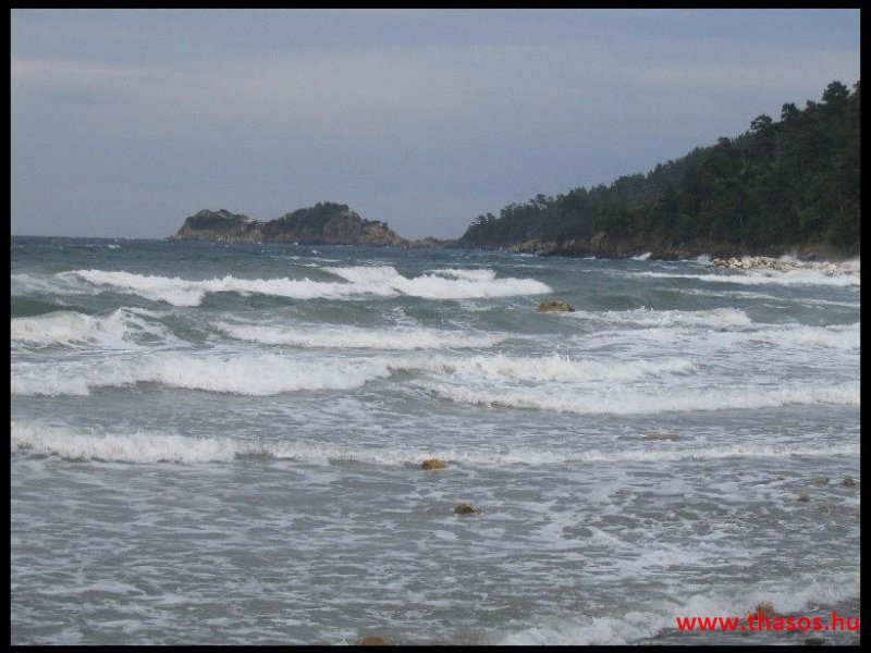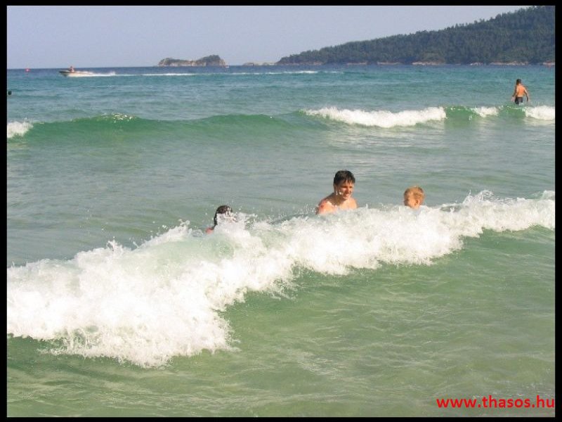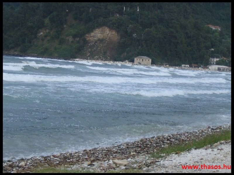 Mivel az idő már javult, de még mindig nem volt az igazi, ismét az autós kirándulást választottuk. A sziget főútján autóztunk több, kisebb-nagyobb kitérővel és megállóval. A főút mellett több helyen is, ahol érdekesebb helyek vannak, ki van alakítva parkoló és kilátó hely. Ilyen helyeken álltunk meg fényképezni és gyönyörködni a kilátásban. De kitérőt tettünk többek között Skala Rachoniou, Skala Prinos, Kalirachi, Skala Marion és Theologos településekre is. Minden helynek megvan a maga szépsége és hangulata. A kör vége fele, mivel a gyerekeknek és nekem is, elvonási tüneteim voltak, természetesen megálltunk Paradiso Beach-en fürödni. A hullámok fantasztikusak voltak. Egészen más képét mutatta a strand, mint a vihar előtt. Nagyon élveztük a hullámokat.