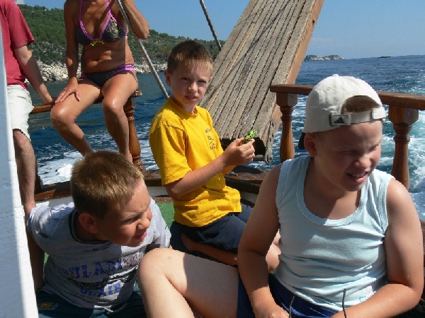 "zsebpeca" szerű valamit, a damilon egy ólom, horog és csali volt, ezt kellett a fenékig lelógatni. Ekkor láttuk egy pillanatra a delfineket először, de sajnos hamar eltűntek. :( A horgászat nem járt sok sikerrel, ezért hamarosan odébb álltunk. Sajnos az új hely sem hozott sikert, hal nélkül maradt a csapat. A horgászat után a hajó megállt a Kinira-szigetnél. Itt volt az első fürdési illetve búvárkodási lehetőség. Ági, mivel ő a gipsz miatt nem tudott merülni, nekünk kiosztotta a feladatot. Szednünk kellett: 1-2 csillagot, 5-6 uborkát, 5-6 sünit (fiatalt és őreget is), és szivacsot. Ezt a szivacs kivételével teljesítettük is. Szivacsot nem találtunk. Miután kolompolt a hajó, mindenki felszállt a hajóra és Ági elkezdett mesélni a szedett "kincsek"-ről. A bátrak kóstolhattak "sün kaviárt" is. A gyerekeknek pedig vízspriccelő versenyt rendezett az uborkákkal. :D A mókázás végére az ebéd is elkészült. A hajó kikötött a Golden Beach déli csücskében, itt fogyasztottuk el a finom ebédet, ami suvlaki, bifteki, tzatziki és kenyér, valamint üdítő volt. Mikor megállt a hajó, akkor láttuk a delfineket másodszor, akkor már több ideig, de sajnos ekkor is messze voltak. :( Ebéd után már csak egy program, a Vathi öbölben való fürdőzés volt hátra. Az úszni tudók ugráltak a hajóról, és búvárkodtak, a többiek pedig kimehettek a partra csónakkal. Mi ezt az időt is búvárkodással töltöttük. Sajnos az idő itt is hamar eltelt és a hajó kiadta a jelet az indulásra. A kikötőbe érkezve elbúcsúztunk és indultunk vissza a szállásra. Én azt mondom, hogy kár lett volna kihagyni ezt a napot. Az idő csodás volt, a hangulat kitűnő. Delfinek is voltak, csak az a baj, hogy messze. Legközelebb remélem a hajónk előtt ugrálva fogok delfineket látni.Az egyik nap elmentünk Potosba is, mert volt aki hennát szeretett volna festetni. Erre a végén mindenkire került valami. Ekkor benéztünk a hegyoldalon lévő Iris Gold-ba is. Nagyon sok szép árujuk van, de meg kellett, hogy állapítsam, nem a mi pénztárcánknak való. :(