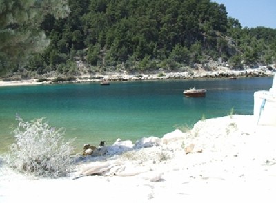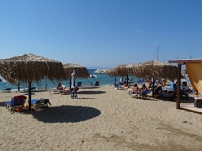 Homokos part - olyan grízszerű a homok -, lassan mélyülő tenger. Főleg görög fiatalok által látogatott strand tavernákkal, vízi sportolási lehetőségekkel. Bár a zene kissé hangos volt (és modern), de nem volt annyira zavaró, hogy eltántorítson bennünket attól a szándékunktól, hogy a délután hátralévő részét itt töltsük.