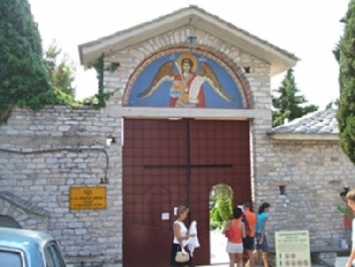 Menetbe szerettük volna megnézni a szirének medencéjét, de nem vettük észre a táblát, hogy hol kell lekanyarodni, így ez kimaradt. A kolostor megtalálása nem volt nehéz, mert közvetlenül az út tenger felőli oldalán van, Aliki után. Mivel a kolostorokba csak megfelelő viseletben lehet belépni, szoknya gyanánt vittem egy nagy strandkendőt, ám előrelátásom hiábavalónak bizonyult, mert a kapus bácsi nem volt megelégedve és fel kellett vennem egy szoknyát. Misi is kapott egy csini nadrágot, Gergőt beengedték sortban. Belépődíjat nem kellett fizetni. Fényképezni, videózni nem lehet, azonban mi sem álltuk meg, hogy egy-egy tájképet ne csináljunk. A kolostorban intenzív építkezés folyik, ezért csak igen kis része látogatható.