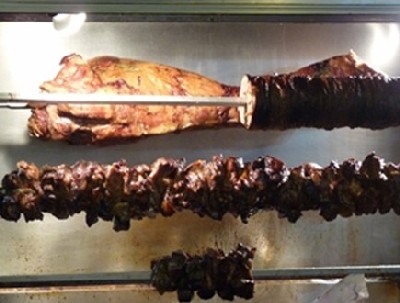 Rendeltünk is egy-egy adag sertéssültet, ami a nyárson forgolódott, plusz három kólát és tzatzikit.