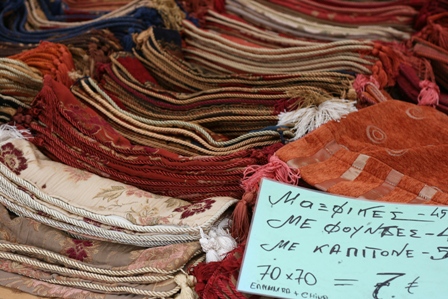 A thassos.hu-n olvastam, hogy hétfőnként Prinosban nagy piac van. Felhős volt a reggel Prinos pedig közel fekszik a sziget fővárosához, A. meg amúgyis imádja a piacozást, nem volt kérdés, hogy megnézzük-e. Ez is egy olyan dolog volt, ami 2 éve kimaradt, ugyanis nem tudtunk róla, hogy van. :) Reggeli után útnak is indultunk. Iszonyú nagy volt a fogalom, már a falu előtt 2 km-rel dugó alakult ki! Nem hittem a szememnek, forgalmi dugóval eddig talán csak a nagyobb városokban találkoztam, de ott sem olyannal, hogy lépésben haldt volna a sor! Megérte végigaraszolni azt a majd' félórát, parkolóhelyet is könnyedén találtunk a közelben, egy gyógyszertár mellett. Mint kiderült, a dugó okozója maga a piac volt, na és az út mentén parkoló autók - illetve mellettük elevickélő buszok. Szőnyeg, zöldség, gyümölcs, virág, amerre a szem ellát, mindemellett megtalálható volt 1-1 standon az összes világmárkát értékesítő ruhaárus is. Szőlőt és dinnyét kínáltak kóstolásra az árusok, a magvaknál még egy pópa is sorban állt, olyan nyüzsgésbe csöppentünk hirtelen, igazi piaci hangulat volt. Na nem ám összetéveszteni a dolgot egy athéni piaci forgataggal, de itt megállta a maga helyét. :)