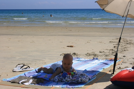 Manó jól aludt, féltem hogy milyen lesz az első (na meg a többi) éjszaka, de nem volt gond. úgy látszik megérte itthon ahhoz szoktatni, hogy bárhol, bármikor képes legyen álomra hajtani a fejét. :) ébredés után A. szokásos körét tette pékáruért, majd reggeli után úgy döntöttünk, hogy irány a strand! Oda mentünk végül, ahol 2 éve utolsó nap voltunk. Annyira megragadott minket az a partszakasz, bántuk hgoy akkor pont a nyaralás végére sikerült rátalálnunk. már az útról lenézve is lélegzetelállító volt, mintha a homok hófehér lenne, a víz pedig a mélykéktől a türkiz-zöldig mindenféle színben pompázott, idén sem változott semmit a helyzet, talán csak abban, hogy több napernyő várt az árnyékért fizetni vágyó strandolókra. Leérve a partra öltözőbódét is felfedeztünk, de a nagy rákészülés ellenére mi voltunk az első érkező család. Milán csak lesett, hogy hová jöttünk, ilyen színeket nem lát, ilyen illatokat nem érez otthon. Élvezte a helyzetet, szinte aludni sem akart a sok izgalmas újdonságtól, csak napoztunk, bohóckodtunk, és semmit tettünk a napsütésben, a tenger zúgását hallgatva. EZ az amire vágytunk. :)
