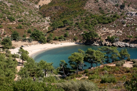 Szinte érezni a tenger hullámzását még most is, ahogy rágondolok, itt hallom a fülemben a zúgást, imádom. Halászhajók és bbq-party-ladikok jöttek-mentek, szemben a párába veszve pedig Szamothraki szigete. Félig-meddig titkon, de oda vágyom, sajnos a költségvetésünkbe nem fért volna bele, pedig ahogy utánajártam, álomészép sziget. Mondjuk nem hallottam még ronda görög szigetről, na de akkoris. :D Sok gyerekes család volt a parton, kis totyogóssal is jöttek, a jövő nyári úton talán már Milán is így seder a homokban, mint az a hurkalábú görög kisfiú. :) Jó három órát sikerült semmittennünk, napfürdőznünk, és úszkálnunk a finom, sós vízben, mikor feltámadt a szél. Tengerészünk persze azonnal reklamált, nem volt neki jó sehogy, ezért útnak indultunk, valahova tovább, dél felé. Szebbnél szebb öblök ezüst, mélykék és türkiz színben váltották egymást.