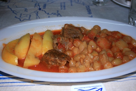 Visszakompolás és egy kis szusszanás után már készültünk is a vacsorához, bejárva Limenas utcáit végül ismét oda mentünk, ahol előző este annyira jót ettünk, a Doukas tavernába. Meglátva minket már fel is pattantak a pincérek, átrendezték a terepet úgy, ahogy azt mi tegnap tettük: a babakocsit bepasszoltuk egy belső szék helyére, az asztalunkat emiatt kicsit odébb is tolva. A. gemistát evett (töltött paradicsom és paprika), én pedig stifadot (görög marhapöri tulajdonképpen). Jó kis nap volt, elfáradtunk mindannyian, Milán konkrétan végigaludta a vacsorát.