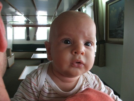 Reggeli után mivel továbbra sem melegedett az idő, útnak indultunk. A kompot Milán nagyon élvezte megint, és az utasok is megcsodálták őt... még mindig hihetetlen volt, hogy hogy állnak a gyerekekhez a görögök. Nem volt olyan nő, aki ne mosolyogott volna rá legalább, de a többség inkább odajött, megcsikizték, dögönyözték, dumáltak neki. És nem, nem úgy kérdezték mint itthon, hogy jajj de aranyos, megsimogathatom? Hanem mintha a világ legtermészetesebb dolga lenne az egész. Fura, mert amíg itthon biztos hogy nagyon zavart volna, ott kint nekem sem volt ezzel semmi bajom, mondjuk sokat lendített a dolgon az is, hogy szemmel láthatóan Tengerészünk is nagyon élvezte a dolgot az első néhány percben, majd megéhezett, jóllakott és elaludt az ölemben. :)