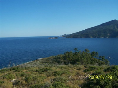 És felértünk. Csodálatos volt! A legmagasabb rész mindkét oldalán kerítés fogta közre az utat, magán olajfa ültevénnyel. A látvány miatti, öböl felőli kapu nyitva állt. Hát, gondoltuk lopni nem akarunk, csak egy kis panorámát, bementünk és amennyire lehetett, leereszkedtünk a csücsök felé. Teljesen nem tudtunk, mert az ősnövényzet túl szúrós, út meg nem vitt le. Nekünk ennyi is elég volt, a táj lenyűgöző! Néztük az Ypsariot és eszünkbe jutott, tavaly mennyire szép volt ugyanez a látvány, csak onnan fentről. A jeep túrát sem felejtjük el soha.