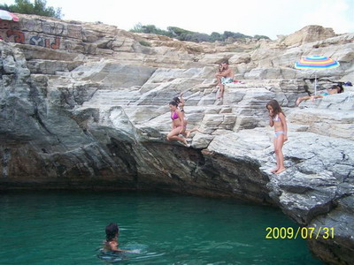 Nem volt nagy szél, teljesen jól be lehetett mászni (na, azért ez sem egyszerű dolog már egy ilyen korú nőnél). A szélére ültem és a két kezemmel tartva magam tudtam beleereszkedni. Kifelé? Csak segítséggel! Rátettem a lábam egy kis tenyérnyi sziklára a befelé lejtő medence falán, aztán a férjem kezét megragadva, kihúzott a vízből. Persze közben humorizált; na szia, majd jövőre találkozunk!