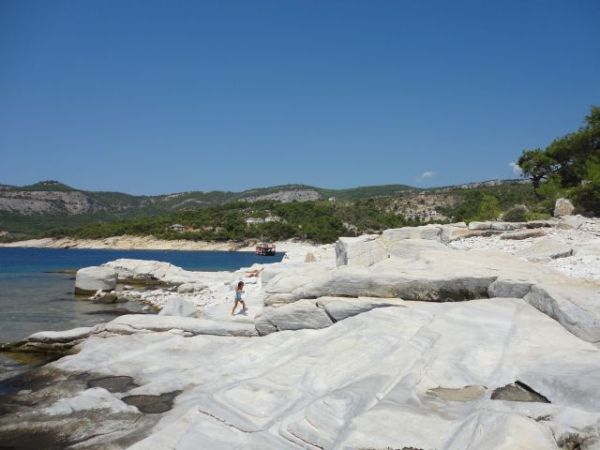 Amerre köveket láttam, arra mentünk, ez volt az irányadó. :) Plusz ugye tudtam, hogy itt van valahol az ókori márványbánya, de akkor még fogalmam sem volt, hogy merre, úgy véltem, hogy nem akkora nagy a sziget, egyszer úgyis rábukkanunk. A romok után jött a fehér sziklákkal övezett tengeri kilátás, és én hegyen-völgyön át másztam rá a hatalmas sziklákra, hogy minél jobban ki tudjak menni a tenger partjához (még jó, hogy vittem úszócipőt, mert rájöttem, hogy mivel ennek a talpa nem csúszik, ezért tökéletes a kövek megmászásához), a párom meg egyfolytában azon aggódott, hogy mikor fogok lezuhanni, vagy megcsúszni valahonnan.