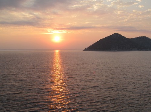 A kompon nincsenek sokan. Mikor elindul a hajó, gyönyörű napfelkeltével örvendeztet meg a természet. Hátunk mögött szemérmesen párába burkolózik a sziget.